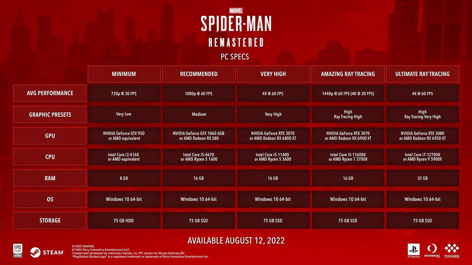 Developed by Insomniac Games in collaboration with Marvel, and optimized for PC by Nixxes Software, Marvel's Spider-Man Remastered on PC introduces an experienced Peter Parker who’s fighting big crime and iconic villains in Marvel’s New York. At the same time, he’s struggling to balance his chaotic personal life and career while the fate of Marvel’s New York rests upon his shoulders.